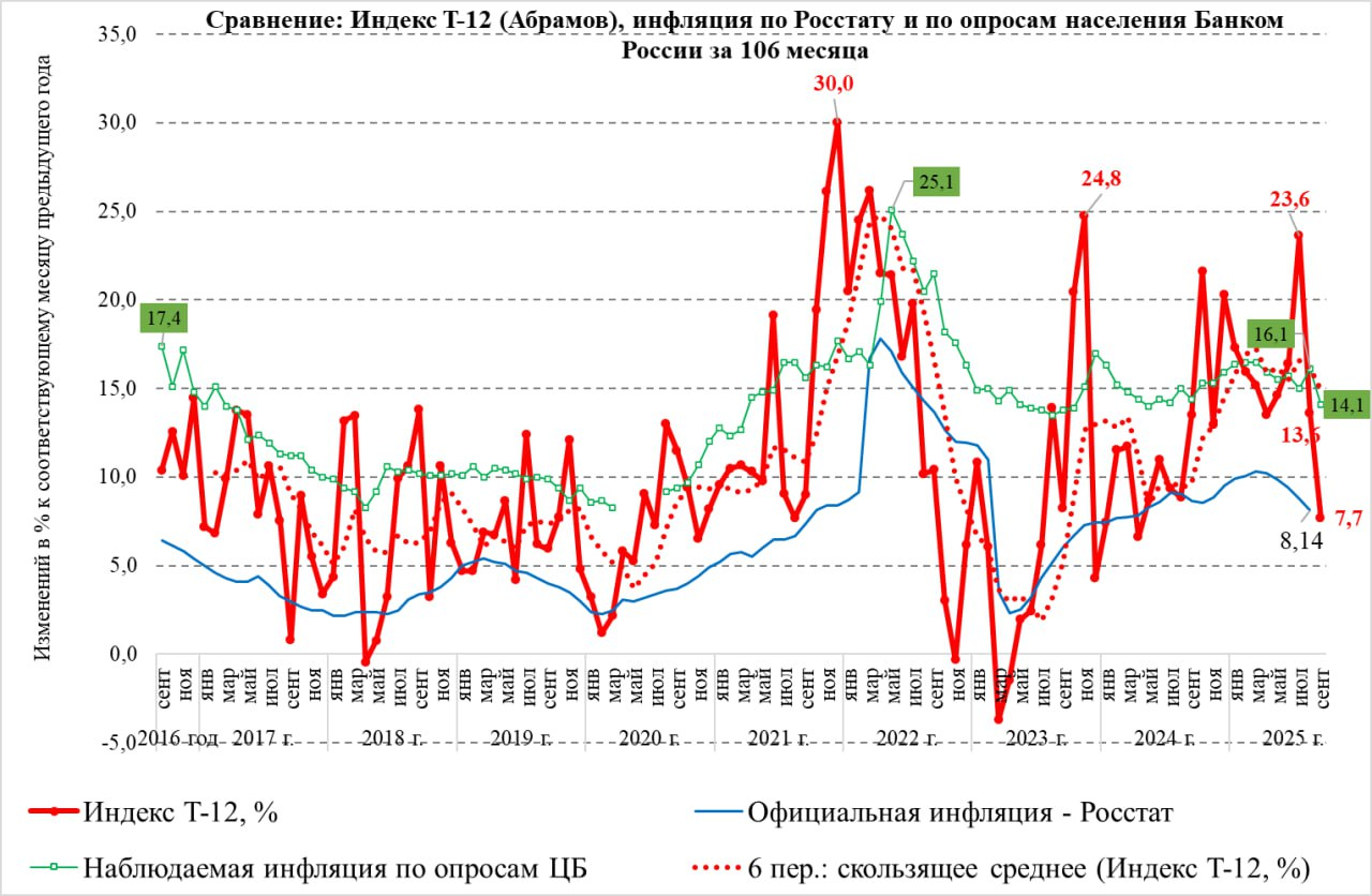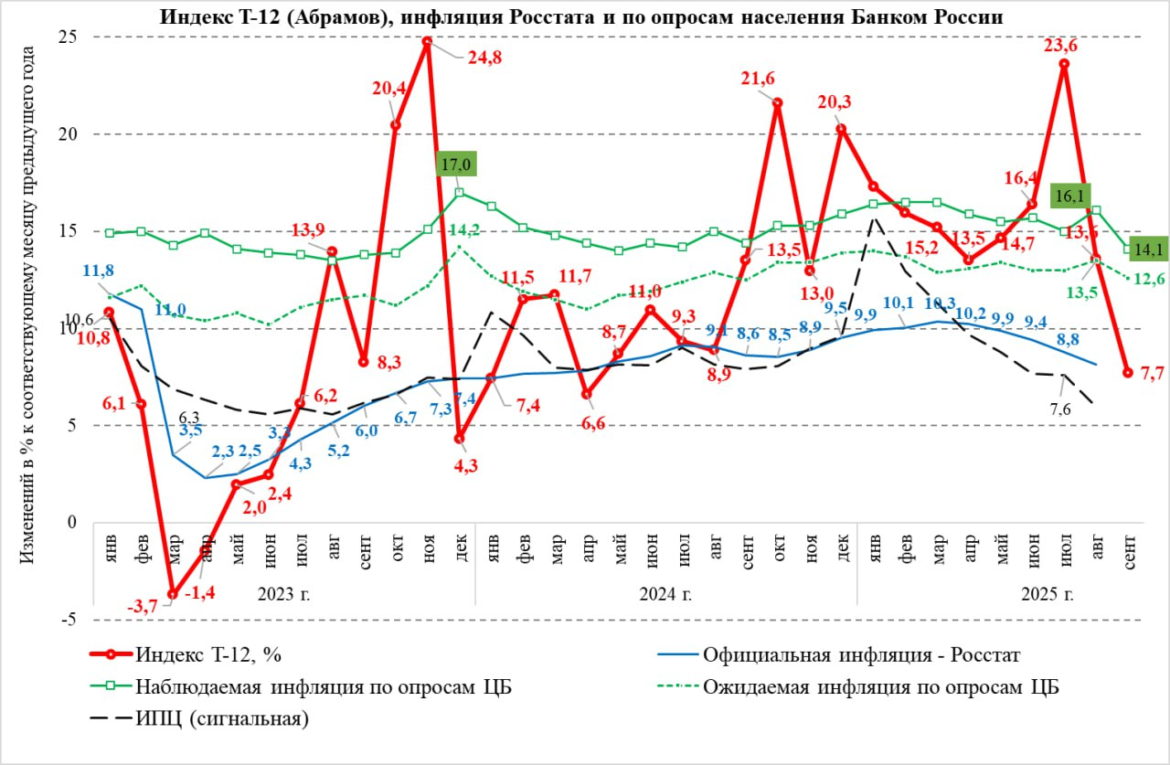 По итогам сентября 2025 года Индекс Т-12 вырос на 7,7% по сравнению с 13,6% в августе.