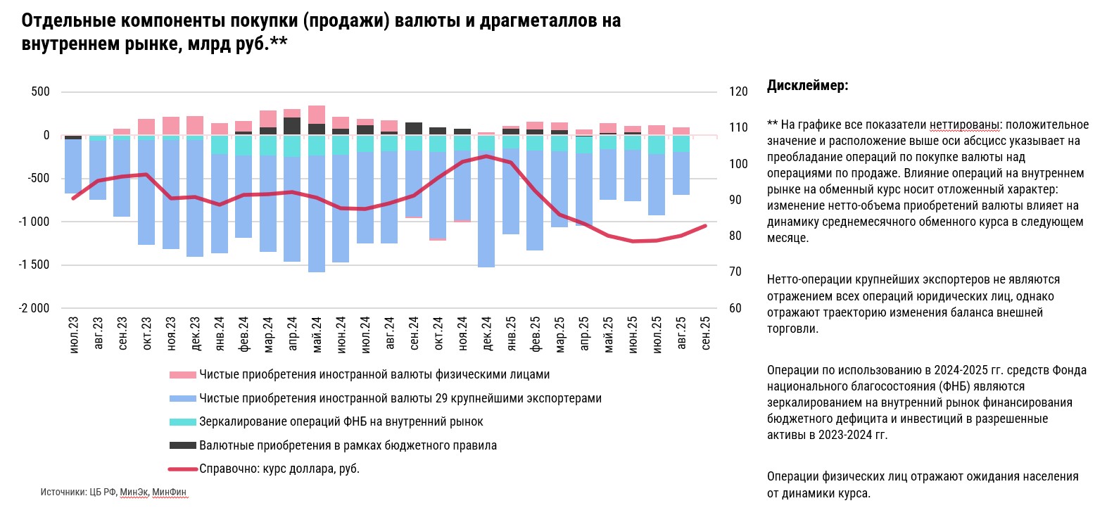 В августе 2025 года правительство обнулило нормативы обязательной продажи валютной выручки экспортерами. При том, что указ об обязательной репатриации валютной выручки продлен до апреля 2026 года, ЦБ ранее отмечал избыточность этой меры: фактические продажи валюты бизнесом превышали зафиксированный в президентском указе норматив. Снижение выручки экспортеров сырья на фоне текущей конъюнктуры экономики и более гибкая конвертация в рублевую ликвидность в среднесрочной перспективе могут послужить драйвером ослабления рубля. Отмена императивного указа позволит поддержать замедляющийся бизнес добывающих отраслей, дав компаниям дополнительное пространство для маневра.