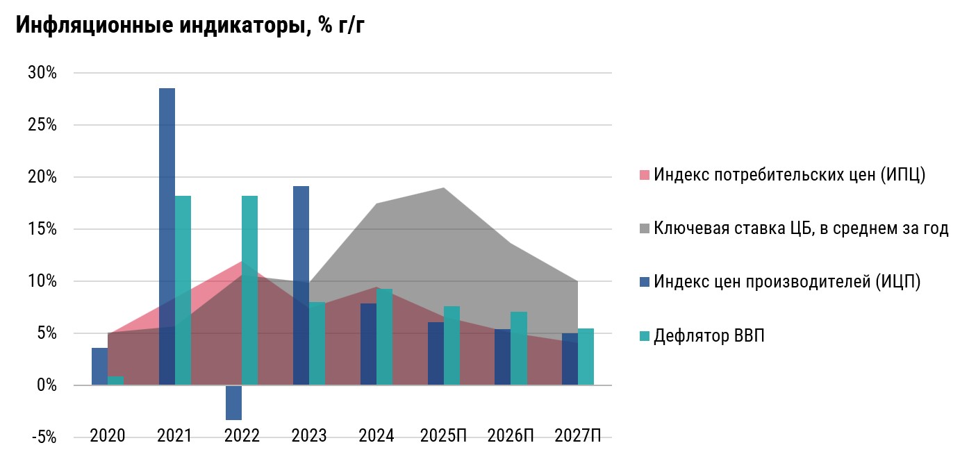Прогнозы ЦБ и других государственных ведомств по срокам достижения официальной цели по инфляции в 4% (введена в 2015 году) отличаются от ожиданий аналитиков. По оценкам участников октябрьского макроэкономического опроса ЦБ, к концу 2026 года ИПЦ может снизиться до 5,1%, а приближение к цели по инфляции вероятно не ранее 2027 года.